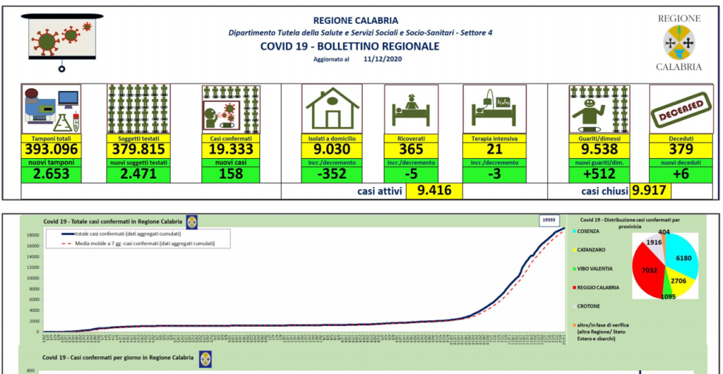 – Reggio Calabria: CASI ATTIVI 1.965 (111 in reparto; 11 presidio ospedaliero di Gioia Tauro; 8 in terapia intensiva; 1835 in isolamento domiciliare); CASI CHIUSI 5.067 (4973 guariti, 94 deceduti).