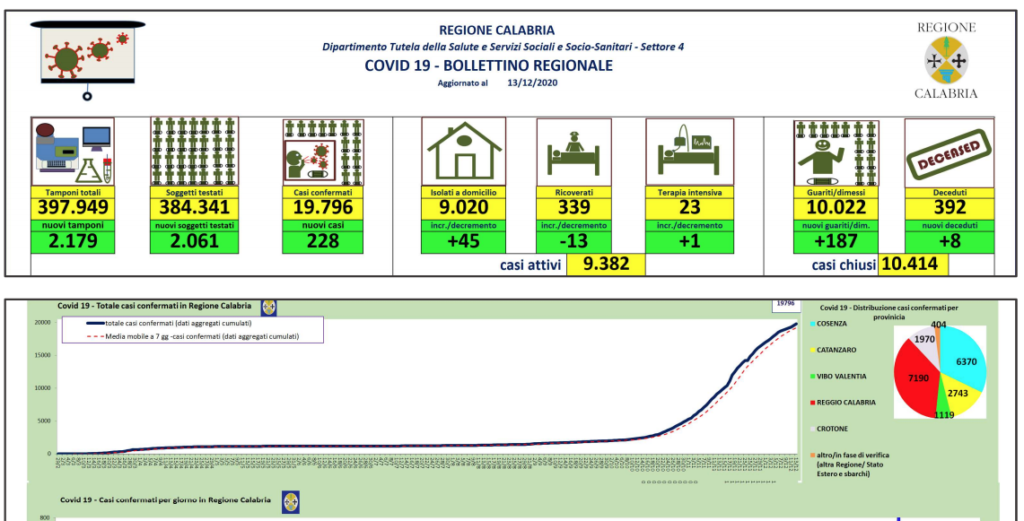 – Reggio Calabria: CASI ATTIVI 1.974 (98 in reparto; 12 Presidio ospedaliero di Gioia Tauro; 10 in terapia intensiva; 1.854 in isolamento domiciliare); CASI CHIUSI 5.216 (5.119 guariti, 97 deceduti).