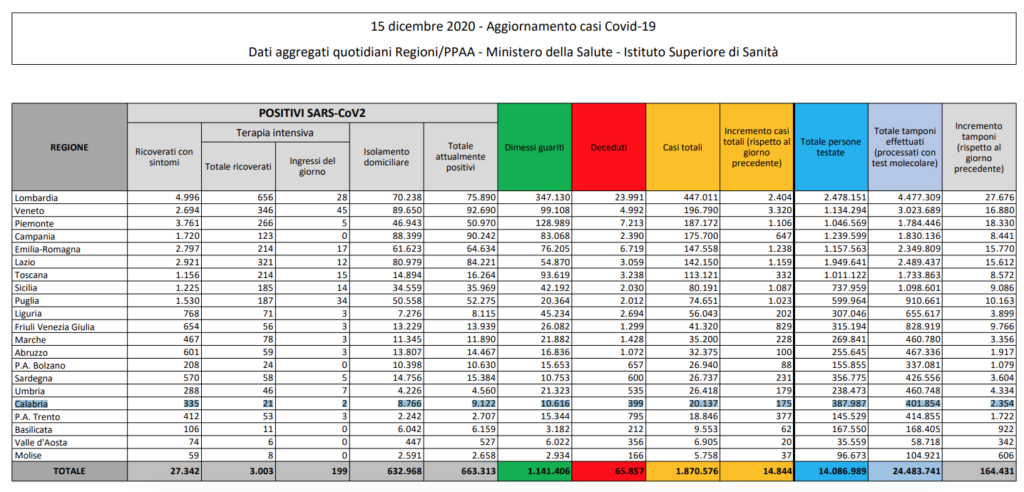 Nel conteggio sono compresi anche i due pazienti di Bergamo trasferiti a Catanzaro, mentre non sono compresi i numeri del contagio pervenuti dopo la comunicazione dei dati alla Protezione civile.