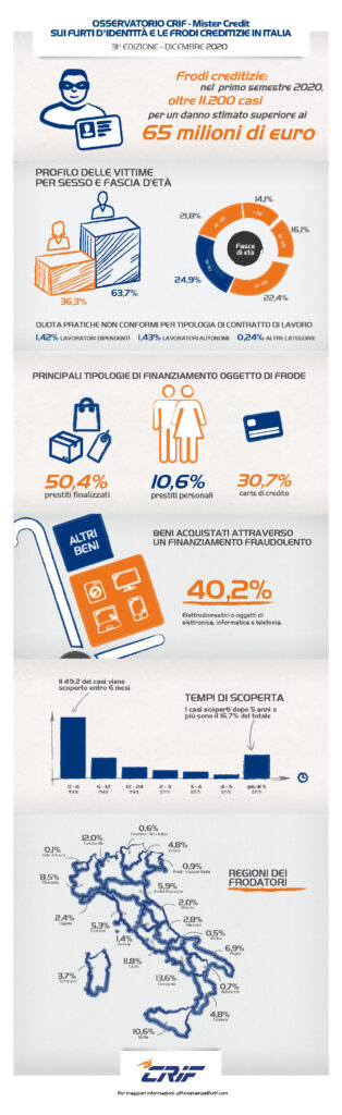 «Nonostante il lockdown e le misure restrittive adottate per contenere la diffusione della pandemia abbiano portato a una maggiore difficoltà ad effettuare frodi fisiche in banca e nei punti vendita, il fenomeno continua ad avere dimensioni preoccupanti» – commenta Beatrice Rubini, Direttore della linea Mister Credit di Crif -. «Nel primo semestre dell’anno abbiamo infatti rilevato un aumento del traffico di dati personali scambiati online, che potranno essere utilizzati per compiere frodi nei prossimi mesi. Non dobbiamo quindi abbassare la guardia ed è indispensabile che i consumatori pongano la massima attenzione per proteggere adeguatamente la propria identità digitale, attivino sms di allerta per controllare le transazioni con le proprie carte di credito e sistemi che avvisano tempestivamente nel caso i dati personali vengano utilizzati per chiedere un finanziamento o stiano indebitamente circolando sul web». Argomenti