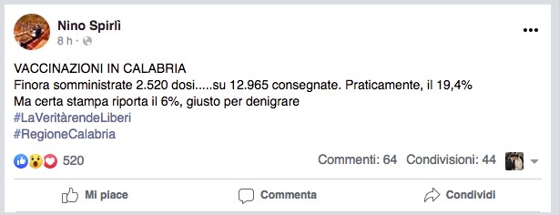 Confusione dei dati delle vaccinazioni anti Covid, con il disallineamento tra quelli di fonte governativa e quelli di fonte regionale, anche se la Calabria comunque resta in fondo alla classifica nazionale. Secondo la Regione, finora sulle 12.995 dosi consegnate alla Calabria per questa prima fase, riservata al personale sanitario e delle Rsa oltre che agli ospiti delle Rsa, si registrano 2.725 somministrazioni, pari al 21% (mancano i dati di Vibo Valentia, che non li ha comunicati). Secondo l’ultimo report pubblicato sul sito del governo in Calabria, le dosi somministrate sono 2.738 pari al 21,1% in Calabria. È evidente che c’è un difetto di comunicazione tra i due livelli, oltre che un difetto di comunicazione interna al sistema calabrese. La Calabria comunque, pur registrando nelle ultime ore un’accelerazione rispetto al dato del 6% della precedente rilevazione, resta penultima su scala nazionale secondo la tabella governativa, peggio fa solo la Sardegna (17,2%), e questo dato rende del tutto fuori luogo e ingiustificatamente trionfalistico il post scritto su facebook (in fondo all’articolo) dal presidente facente funzioni, Nino Spirlì, per il quale «certa stampa riporta solo il 6% giusto per denigrare». La Calabria infatti resta lontanissima dalla media nazionale del 54,1%. Su scala nazionale le migliori performance sono quelle di Lazio (77%) e Toscana (77,9).