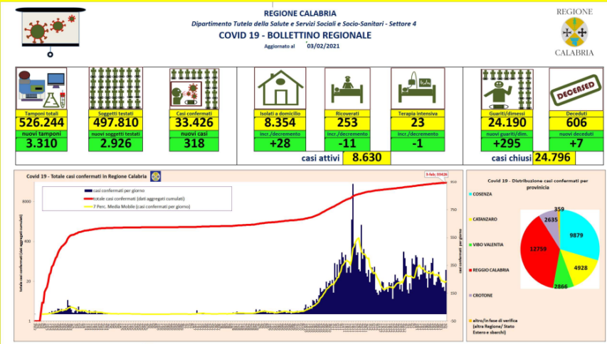 - Vibo Valentia: CASI ATTIVI 447 (14 ricoverati, 433 in isolamento domiciliare); CASI CHIUSI 2.419 (2379 guariti, 40 deceduti).