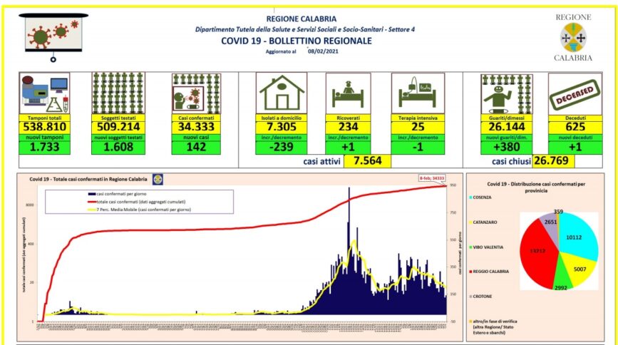– Reggio Calabria: CASI ATTIVI 1.980 (83 in reparto all’AO di Reggio Calabria; 13 in reparto al P.O di Gioia Tauro; 11 in terapia intensiva; 1.873 in isolamento domiciliare); CASI CHIUSI 11.232 (11.052 guariti, 180 deceduti).