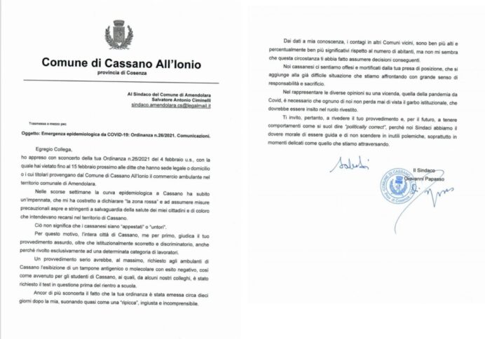 Una sua ordinanza, però, ha dato vita ad un incidente diplomatico con Cassano allo Ionio, col sindaco Gianni Papasso – che ha stigmatizzato la faccenda – e coi i cassanesi. Il provvedimento emanato lo scorso 4 febbraio e firmato dal sindaco di Amendolara vieta «in via precauzionale il commercio ambulante nel territorio comunale di Amendolara fino al 15 febbraio 2021 da parte di ditte che hanno sede legale o domicilio nel Comune di Cassano allo Ionio o i cui titolari provengano dal medesimo comune». E tutto ciò perché Cassano è ancora zona rossa.