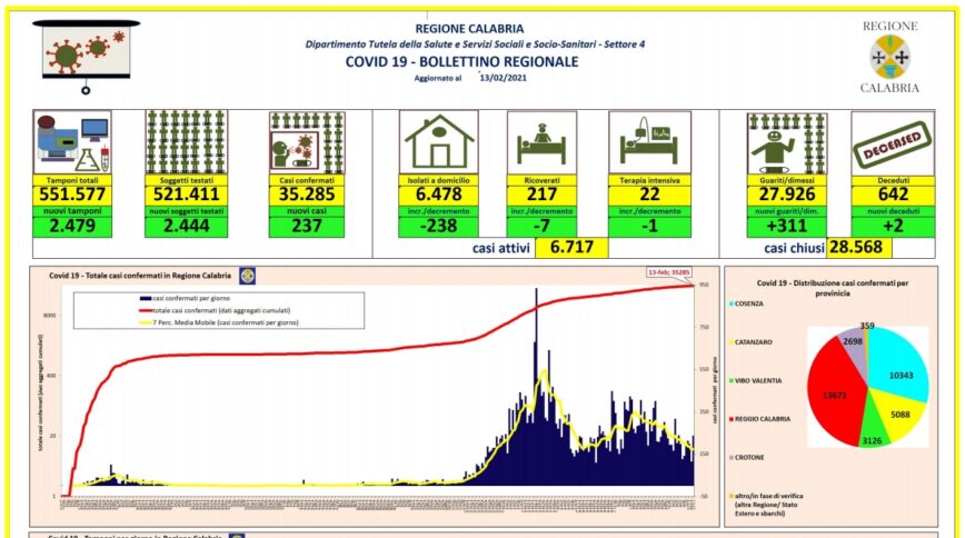 In Calabria ad oggi sono stati sottoposti a test 521.411 soggetti per un totale di tamponi eseguiti 551.577 (allo stesso soggetto possono essere effettuati più test). Le persone risultate positive al Coronavirus sono 35.285 (+237 rispetto a ieri), quelle negative 486.126. Sono questi i dati giornalieri relativi all’epidemia da Covid-19 comunicati dal dipartimento Tutela della Salute.
