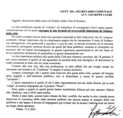 Il messaggio lanciato sui social da Idà: «Cari Concittadini, pochi minuti fa ho rassegnato le dimissioni dalla carica di Sindaco della nostra amata Città. Volevo ringraziare ognuno di voi per il sostegno e la fiducia che in questi anni di amministrazione mi avete sempre accordato e che non ho mai, nemmeno per un istante, tradito. Un ringraziamento particolare va ai consiglieri comunali e agli assessori che hanno condiviso con me la responsabilità di amministrare Rosarno. Un sentimento di gratitudine mi sento di rivolgerlo anche ai dipendenti comunali, dei quali ho avuto modo di apprezzare le qualità e l’impegno».