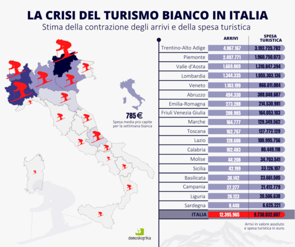 Sono cinque le destinazioni turistiche invernali che risultano maggiormente penalizzate dalla mancata riapertura delle piste da sci e degli impianti sciistici: Trentino-Alto Adige, Piemonte, Valle d’Aosta, Lombardia e Veneto la cui perdita di spesa turistica rappresenta oltre l’86 per cento dei mancati introiti complessivi italiani, pari a 8,4 miliardi di euro.
