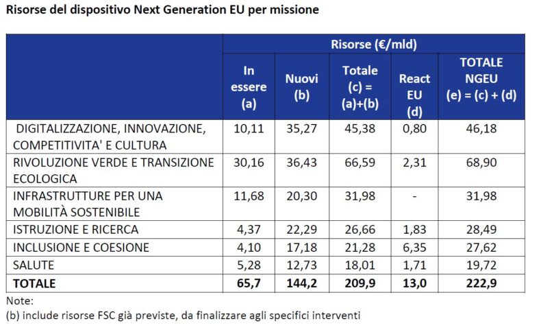 In particolare sotto il capitolo dell’efficientamento energetico e la riqualificazione degli edifici il Pnrr allo stato destina 29,35 miliardi che diventano 35,95 (se si sommano le altre risorse aggiuntive), mentre sulla “Transizione energetica e la mobilità locale sostenibile” si annoverano 18,22 miliardi (20,52 complessivi). Mentre 15,03 miliardi (a cui si somma un altro miliardo del Feasr) sono dedicati ad interventi di “Tutela e valorizzazione del territorio e della risorsa idrica” ed infine 6,3 miliardi a quelli relativi ad implementare il concetto di “Impresa verde ed economia circolare”.