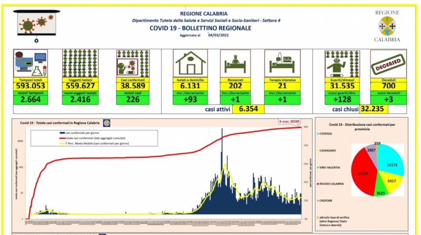 LAMEZIA TERME In Calabria ad oggi sono stati sottoposti a test 559.627 soggetti per un totale di 593.053 tamponi eseguiti (allo stesso soggetto possono essere effettuati più test). Le persone risultate positive al Coronavirus sono 38.589 (+226 rispetto a ieri), quelle negative 521.038.Sono questi i dati giornalieri relativi all’epidemia da Covid-19 comunicati dal dipartimento Tutela della Salute.