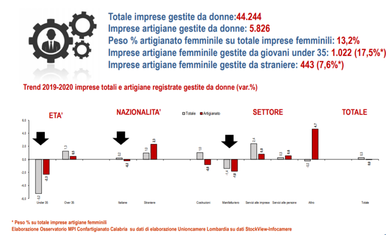 Le imprese rosa della Calabria sono 44.244, e di queste il 13,2% sono artigiane (5.826), di cui 1.022 (pari al 17,5% % su totale imprese artigiane femminili) gestite da giovani under 35, mentre quelle guidate da straniere sono 443 (7,6% sul totale imprese artigiane femminili). I maggiori settori in cui operano solo quelli dei servizi alla persona, con il 62,3% delle imprese registrate – in lieve aumento tra il 2019 ed il 2020 (più 1,3%) – e del manifatturiero, in cui si concentra il 24,2% delle imprese.