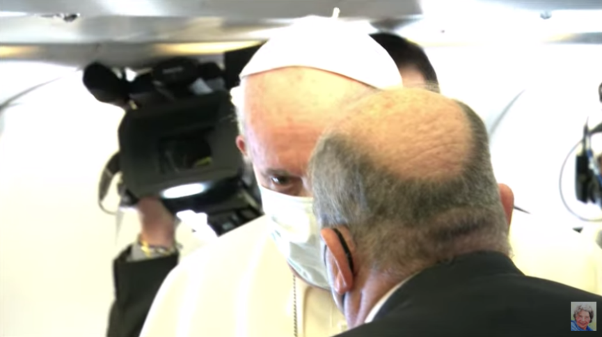 Il giornalista (di origini calabresi) della Reuters Pullella consegna il volume al pontefice nel volo per la visita apostolica in Iraq
