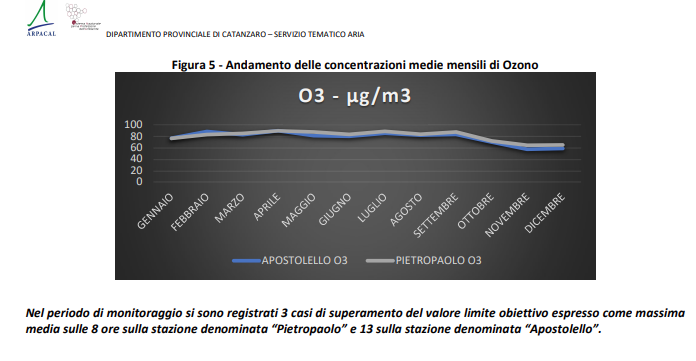 Altra componente che durante il monitoraggio ha registrato il superamento del valore limite di legge è l’Ozono (O3). Tre casi sono stati individuati sulla stazione “Pietropaolo” e 13 sulla stazione “Apostolello”. L’ozono è un elemento gassoso dell’atmosfera, molto reattivo e aggressivo. Negli strati alti dell’atmosfera terrestre (stratosfera) aiuta a proteggere la vita sulla Terra, creando uno scudo che filtra i raggi ultravioletti del sole. Negli strati bassi dell’atmosfera terrestre (troposfera) è presente in concentrazioni elevate a seguito di situazioni d’inquinamento e provoca disturbi irritativi all’apparato respiratorio e danni alla vegetazione. Oltre che in modo naturale, per interazione tra i composti organici emessi in natura e l’ossigeno dell’aria sotto l’irradiamento solare, l’ozono si produce anche per effetto dell’immissione di solventi e ossidi di azoto dalle attività umane. L’immissione di inquinanti primari (prodotti dal traffico, dai processi di combustione, dai solventi delle vernici, dall’evaporazione di carburanti etc.) favorisce quindi la produzione di un eccesso di ozono rispetto alle quantità altrimenti presenti in natura durante i mesi estivi. Per quanto attiene all’ozono troposferico i limiti da rispettare stabiliti dal D.Lgs. 155/2010 per la protezione della salute umana sono riferiti sia al breve periodo sia al medio-lungo periodo. Per il breve periodo sono definite 2 soglie di concentrazione limite: la “soglia di informazione”, pari a 180 µg/m3 di ozono misurato in aria come media oraria; la “soglia di allarme” pari a 240 µg/m3 di ozono misurato in aria come media oraria.