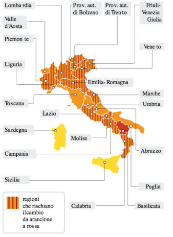 Accanto a Campania, Basilicata e Molise, scontato il passaggio in rosso anche di Lombardia, Piemonte, Emilia Romagna e Marche. Peggioramento anche per il Friuli Venezia Giulia, che era in arancione da una sola settimana, e per le province di Trento e Bolzano, quest’ultima già in auto-lockdown.