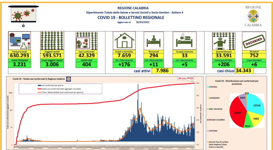 I casi confermati oggi sono così suddivisi: Cosenza 176, Catanzaro 55, Crotone 55, Vibo Valentia 54, Reggio Calabria 64, Altra Regione o Stato estero 0.