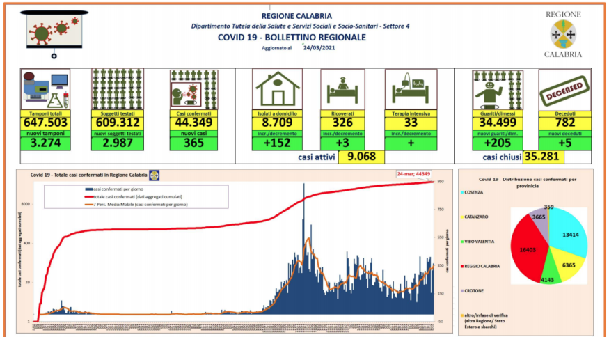 Covid, 365 nuovi contagi in Calabria. Oggi altri cinque decessi – GRAFICO