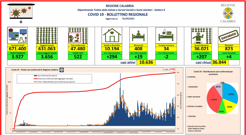 – Catanzaro: CASI ATTIVI 2.521 (59 in reparto all’AO di Catanzaro; 9 in reparto al presidio di Lamezia Terme; 24 in reparto all’AOU Mater Domini; 12 in terapia intensiva; 2.417 in isolamento domiciliare); CASI CHIUSI 4.413 (4.314 guariti, 99 deceduti).