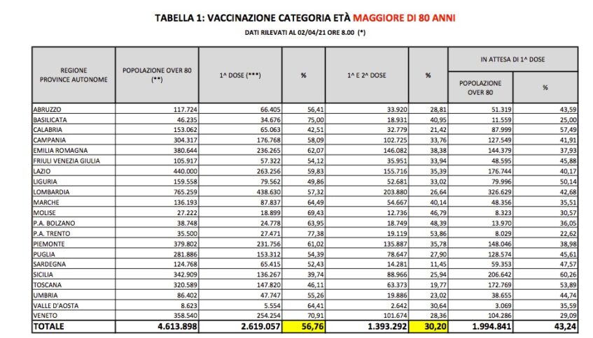 Secondo il report, aggiornato al 2 aprile, in Calabria gli over 80 (una platea complessiva di 153.062 unità) che hanno ricevuto la prima dose sono stati 65.063 (+3,5% rispetto alla settimana precedente), pari al 42,51% (peggio solo la Sicilia con il 39,74%), a fronte di una media nazionale superiore al 56%, mentre in attesa della prima dose sono 87.999 anziani, ossia il 57,49% (anche qui peggio solo la Sicilia), mentre gli over 80 che hanno già ricevuto la seconda dose sono 32.779, pari al 21,42% (qui peggio della Calabria fanno Sardegna e Toscana).