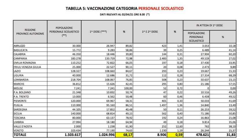 Per quanto riguarda il personale scolastico, secondo il report settimanale del governo, aggiornato sempre al 2 aprile, la prima dose è stata somministrata a 18.446 operatori, pari al 39,80% (peggio fa solo la Liguria con il 31,7%, la media nazionale supera il 68%) mentre in attesa della prima dose sono in 27.904 (60,2% del personale scolastico: la seconda dose invece è stata somministrata a 144 operatori, pari allo 0,31%. Migliore, invece, la situazione della Calabria con riferimento agli ospiti delle Rsa (il 100% ha ricevuto la prima dose, il 60,5% anche la seconda dose), il personale sanitario (l’84,97% ha ricevuto la prima dose, il 79,9% anche la seconda dose), e gli anziani tra i 70 e i 79 anni (il 2,90% ha ricevuto prima e seconda dose, la media nazionale è dell’1,87%). (c. a.)