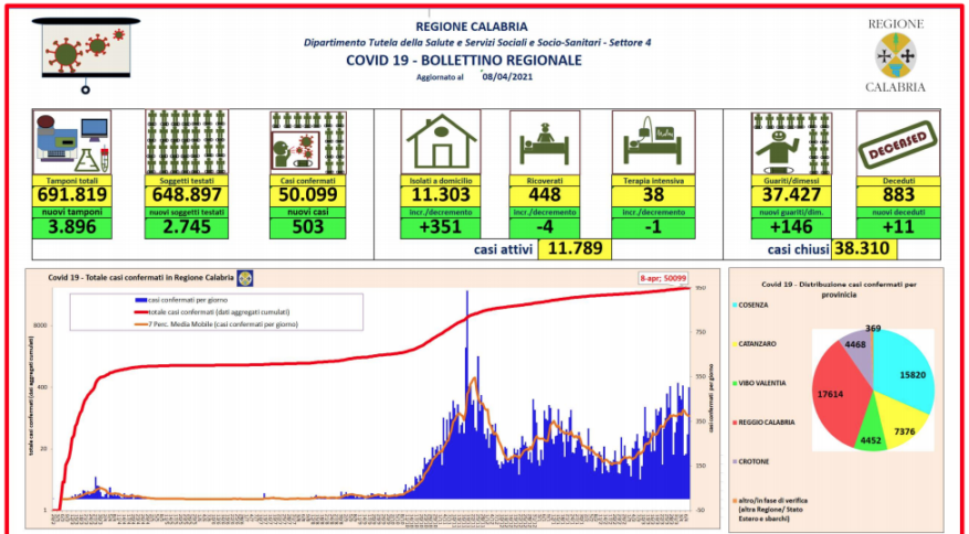 – Vibo Valentia: CASI ATTIVI 434 (17 ricoverati, 417 in isolamento domiciliare); CASI CHIUSI 4.018 (3945 guariti, 73 deceduti).