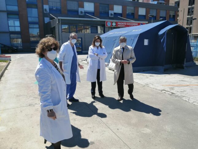 Sedie a rotelle, lettini e un paravento per «chi lotta contro il virus». Il sindaco chiede chiarezza sui vaccini e la riconversione dell’ospedale da campo