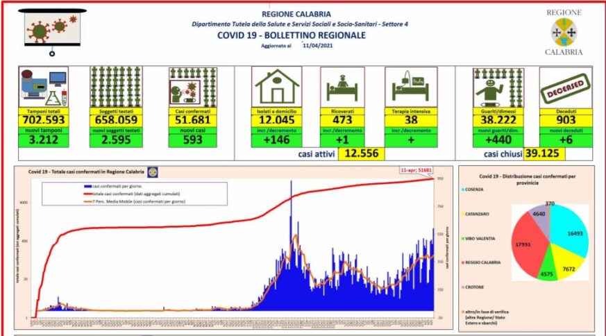- Crotone: CASI ATTIVI 1.109 (43 in reparto; 1.066 in isolamento domiciliare); CASI CHIUSI 3.531 (3.471 guariti, 60 deceduti).