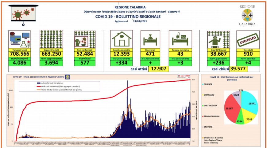 – Vibo Valentia: CASI ATTIVI 450 (15 ricoverati, 435 in isolamento domiciliare); CASI CHIUSI 4.144 (4071 guariti, 73 deceduti).