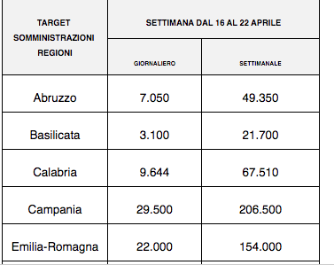 ROMA L’attuale Piano vaccinale Anticovid assegna a ciascuna Regione/Provincia Autonoma un target giornaliero di somministrazioni da rispettare nell’arco di una settimana. Tali valori vengono confermati ai referenti regionali dieci giorni prima dell’inizio della settimana. Il rispetto da parte delle Regioni dei target giornalieri è essenziale per l’avvicinamento progressivo all’obiettivo delle 500mila somministrazioni al giorno indicato nel piano vaccinale, di previsto raggiungimento nell’ultima settimana di aprile, senza che si verifichino soluzioni di continuità nell’attività di somministrazione. I valori target sono specifici per ogni Regione, nell’ottica di un aumento progressivo del numero di cittadini cui vengono somministrati i vaccini, e vengono definiti sulla base di una gradualità che consentirà di raggiungere gli obiettivi auspicati, rapportando le capacità di somministrazione alla disponibilità di dosi.