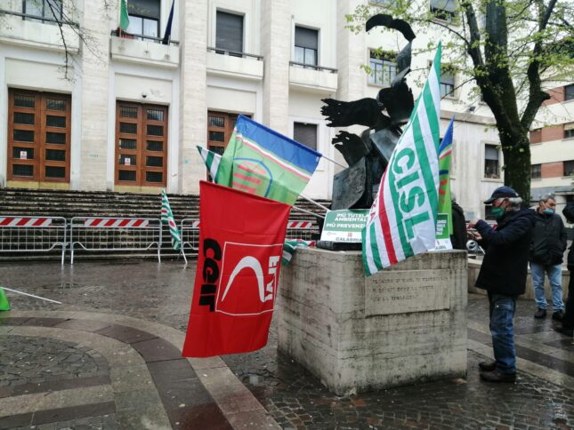 COSENZA Le bandiere di Cgil, Cisl e Uil sventolano, nonostante la pioggia, in piazza XI settembre a Cosenza. La protesta dei lavoratori forestali, organizzata davanti la Prefettura, ha coinvolto le Federazioni territoriali e comprensoriali Flai, Fai e Uila della provincia di Cosenza. «La profonda crisi, soprattutto organizzativa e finanziaria, nella quale è precipitata la forestazione calabrese, ha raggiunto il suo apice», dicono i sindacati. «Consapevoli dell’importanza della forestazione nella lotta al rischio e al dissesto idrogeologico, agli incendi boschivi, dell’importanza delle superfici boscate per il contrasto ai cambiamenti climatici e del grande ruolo che riveste la forestazione contro lo spopolamento delle aree rurali, urge di un sostanzioso ed immediato ricambio generazionale».