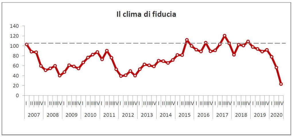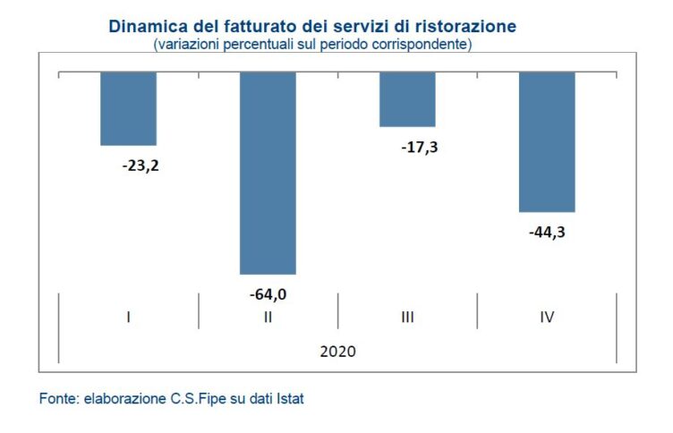 Secondo le stime della Federazione italiana pubblici esercizi (Fipe) – organizzazione interna a Confcommercio – in Italia solo nel IV trimestre del 2020 si sono persi 11,1 miliardi di fatturato nella ristorazione rispetto all’equivalente periodo del 2019 portando le perdite per l’intero 2020 a 34,4 miliardi di euro. Praticamente è andato in fumo oltre un terzo del fatturato dell’anno precedente: -36,2%. Così come è crollato il clima di fiducia tra gli imprenditori del settore.