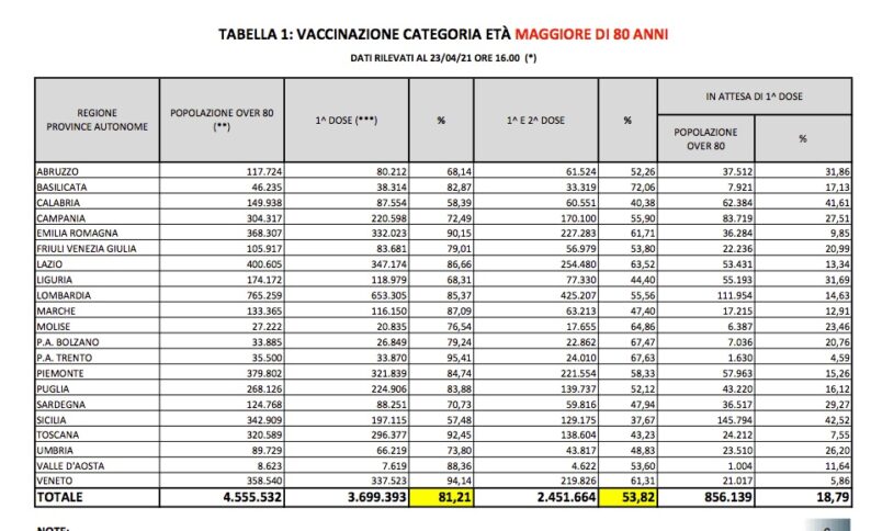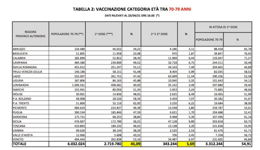 Report del governo: regione penultima nella percentuale degli over 80 e 70 ancora in attesa della prima dose. Ritardi per il personale scolastico