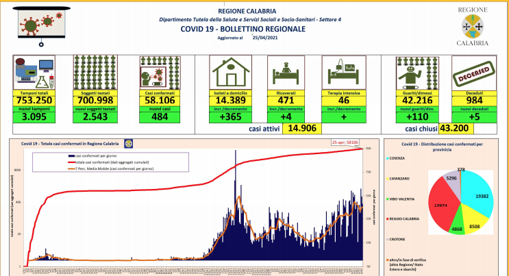 - Vibo Valentia: CASI ATTIVI 451 (16 ricoverati, 435 in isolamento domiciliare); CASI CHIUSI 4.417 (4.340 guariti, 77 deceduti).