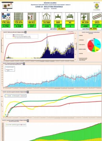 - Cosenza: CASI ATTIVI 8.217 (106 in reparto AO di Cosenza; 37 in reparto al presidio di Rossano; 4 in terapia intensiva l presidio di Rossano; 16 al presidio ospedaliero di Acri; 25 al presidio ospedaliero di Cetraro; 0 all’Ospedale da Campo; 17 in terapia intensiva, 8.012 in isolamento domiciliare); CASI CHIUSI 11.905 (11446 guariti, 459 deceduti).