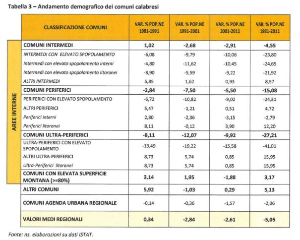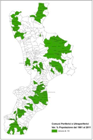 Stando agli indicatori dell’Istat, dal 1981 al 2011 si è assistito ad un vero e proprio esodo da questi territori. Soprattutto nei comuni ricadenti nelle aree ultra-periferiche. In questo lasso di tempo infatti la variazione della popolazione è stata pari al 27,21%. Una flessione consistente che ha interessato anche le zona periferiche: qui la popolazione in 30 anni è diminuita di oltre il 15%. Seppure il fenomeno dello spopolamento interessi l’intera regione, il dato è nettamente superiore alla media regionale del periodo (-5,05%). A dimostrazione della fragilità di queste aree periferiche della Calabria. Una fragilità che è dimostrabile anche da altri indicatori: il tasso d’invecchiamento della popolazione residente, l’alta percentuale di soggetti dipendenti (cioè persone non in età lavorativa) e il basso reddito pro capite. Nei comuni che rientrano nelle aree ultra periferiche, l’indice di vecchiaia (rapporto percentuale tra ultrasessantacinquenni e popolazione con meno di 15 anni) è pari a 211,40, mentre in quelle periferiche questo parametro resta comunque elevato (173,04) rispetto alla media regionale (146,88). Così come resta per entrambe le aree alto l’indice di dipendenza: 57,48 (comuni ultra periferici), 54,33 (comuni periferici).