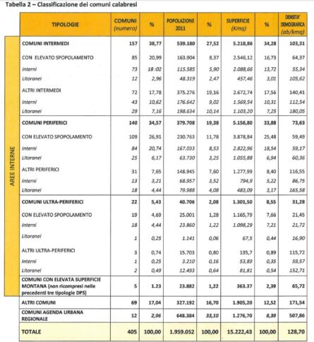 Numeri alla mano, in Calabria ricadono 319 comuni in territorio classificati come area interna: circa 80% del totale (per l’esattezza il 78,7%). Una percentuale di gran lunga superiore a quella italiana che si ferma al 52%. Una categoria che tratteggia cioè quei comuni che ricadono nelle aree intermedie, periferiche ed ultra periferiche. Una distinzione effettuata sulla base della distanza in termini temporali dai centri che garantiscono l’accesso ai servizi essenziali: istruzione, salute e mobilità. In questi territori calabresi vive poco più del 50% della popolazione. In particolare nei comuni periferici ed ultra periferici. Qui l’incidenza è pari al 40% contro la media nazionale del 22,5%.