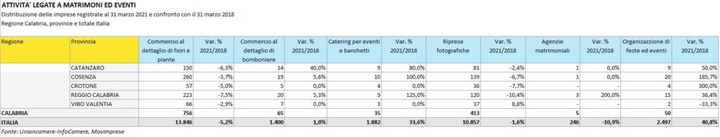 Un comparto importante per l’economia complessiva italiana ricordando che genera un giro d’affari da 15 miliardi di euro l’anno. Un segmento produttivo che per la Calabria vale, stando alle stime di Assoeventi, circa 400 milioni di euro di fatturato l’anno nei settori immediatamente riferibili all’organizzazione dell’evento (catering, location, fotografi, fiorai, agenzie di viaggio …). A questo va sommato un non quantificabile, ma sicuramente corposo, volume di affari indiretto connesso ai matrimoni di ulteriori comparti.