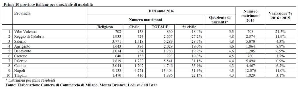 Un settore quello dei matrimoni, come dicevamo che è decisamente rilevante per la regione che segna l’indice più elevato di nuzialità in Italia: 4,4 per mille abitanti (contro la media nazionale di 3,4). Con Vibo Valentia e Reggio rispettivamente al primo e secondo posto nel Paese per tasso di nozze celebrate rispetto ai residenti.
