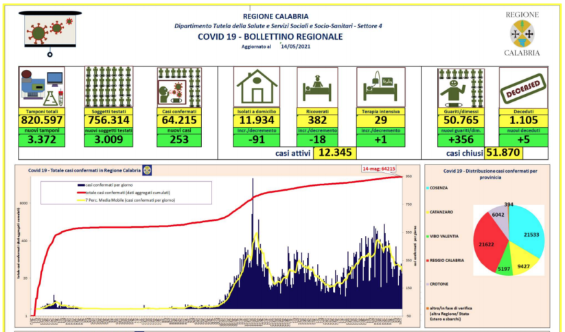 – Cosenza: CASI ATTIVI 7.345 (95 in reparto AO di Cosenza; 32 in reparto al presidio di Rossano; 1 ricoverato in terapia intensiva al presidio di Rossano; 13 al presidio ospedaliero di Acri; 10 al presidio ospedaliero di Cetraro; 0 all’Ospedale da Campo; 11 in terapia intensiva, 7.178 in isolamento domiciliare); CASI CHIUSI 14.188 (13.691 guariti, 497 deceduti).