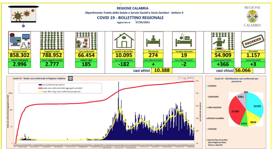 – Reggio Calabria: CASI ATTIVI 1.334 (68 in reparto all’AO di Reggio Calabria; 26 in reparto al P.O di Gioia Tauro; 4 al P.O. di Melito; 6 in terapia intensiva; 1230 in isolamento domiciliare); CASI CHIUSI 20.966 (20.650 guariti, 316 deceduti).