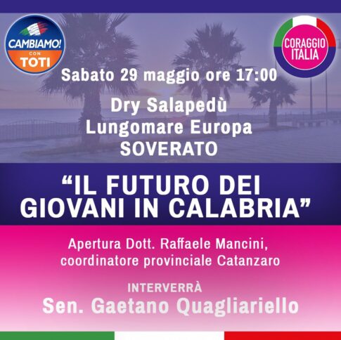 L’incontro vedrà la partecipazione, tra gli altri, del coordinatore regionale del partito, il senatore Francesco Bevilacqua, del senatore Gaetano Quagliariello (in Calabria fino ai primi giorni della prossima settimana), responsabile Enti Locali della creatura fondata dal presidente della Liguria Giovanni Toti, e del coordinatore provinciale di Catanzaro, l’ex sindaco di Soverato Raffaele Mancini, fresco di ingresso nella direzione nazionale.