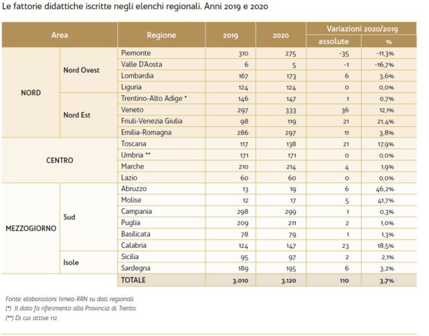 Entrando nel dettaglio calabrese le fattorie didattiche iscritte negli elenchi regionali nel 2020 sono 147 di cui 97 concentrate nel Cosentino, 27 nel Catanzarese, dieci nel Crotonese, 9 in provincia di Vibo e 4 nel Reggino. Nel corso di un anno (2020 su 2019) il totale di questo numero è cresciuto in Calabria di ben il 18,5%. Decisamente molto al di sopra della media nazionale (+3,7%) e che pone la regione al decimo posto in Italia per la presenza di fattorie didattiche sul territorio. Parallelamente a questo incremento assoluto è cresciuto anche quello degli agriturismi in cui è presente questo genere di attività. Si è passati dagli 8 del 2011 al doppio del 2019, con un incremento dell’ultimo anno monitorato di ben il 23,1%. A dimostrazione della multidisciplinarietà offerta dal segmento che annovera anche l’agricoltura sociale e che in Calabria vede attive 18 fattorie: 12 nel Cosentino, 5 nel Catanzarese e 1 nel Vibonese. Tutte potenzialità che potranno essere messe a frutto con la ripartenza, dopo l’anno orribile che ha caratterizzato il 2020 stando ai dati di Agriturist, il comparto calabrese ha perso l’80% dei ricavi. Secondo l’organizzazione di categoria, in regione «sono stati più penalizzati gli agriturismi in montagna e collina».