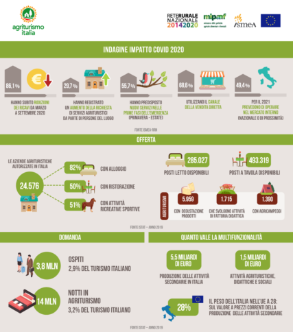 Anche se rispetto ad altri segmenti della costellazione di imprese che ruotano attorno alla ricettività, l’agriturismo ha dimostrato maggiore capacità di resilienza per le caratteristiche proprie di questo genere di attività che fa del contatto con la natura e dunque con gli spazi aperti, ma soprattutto con la produzione agricola d’eccellenza i suoi punti di forza. Ma i contraccolpi di quella crisi innescata dalle misure introdotte dal Governo per contenere la diffusione dell’epidemia sono stati decisamente rilevanti. In Italia Agriturist – prima associazione di agriturismo in Italia, per la promozione e la valorizzazione della rete degli oltre 20.000 agriturismi italiani – ha stimato una perdita in un anno di 1,2 miliardi di euro di ricavi. Un crollo dei fatturati che ha interessato soprattutto le strutture che hanno puntato meno sulla vendita diretta dei prodotti agricoli, scommettendo di più sulla vocazione ricettiva, banchettistica e multidisciplinare legata alle fattorie didattiche e sociali.