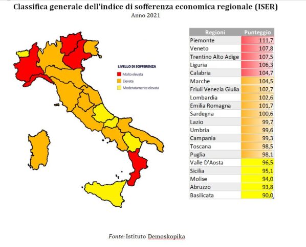 Per stimare l’impatto della crisi pandemica sulla condizione socio-economica della popolazione calabrese soccorrono alcuni indicatori che ritraggono – seppur ancora in modo parziale – un quadro decisamente a tinte fosche. Su tutti, le stime di Demoskopika che pone la Calabria tra le sei regioni in Italia «più fiaccate» dalla crisi economica causata dall’epidemia. Passando in rassegna l’indicatore Iser – sistema introdotto per classificare il livello si sofferenza economica dei territori – l’Istituto ha inserito la Calabria tra le regioni nell’area dei sistemi economici e sociali con un livello di sofferenza “molto elevato”: 104,7 punti (quarta regione nella classifica nazionale di questo indicatore) con una flessione quantificabile in oltre 23 mila occupati in meno (-4,3%). Da qui l’incremento del numero di famiglie precipitate nella condizione di povertà. Si è passato dal 23,4% del tasso di incidenza della povertà relativa del 2019 al 24,3% del 2020. Demoskopica ha calcolato che in un solo anno l’incremento delle famiglie povere è stato pari a 7.291 con un tasso di crescita pari a circa l’ 1% (0,9% per l’esattezza).