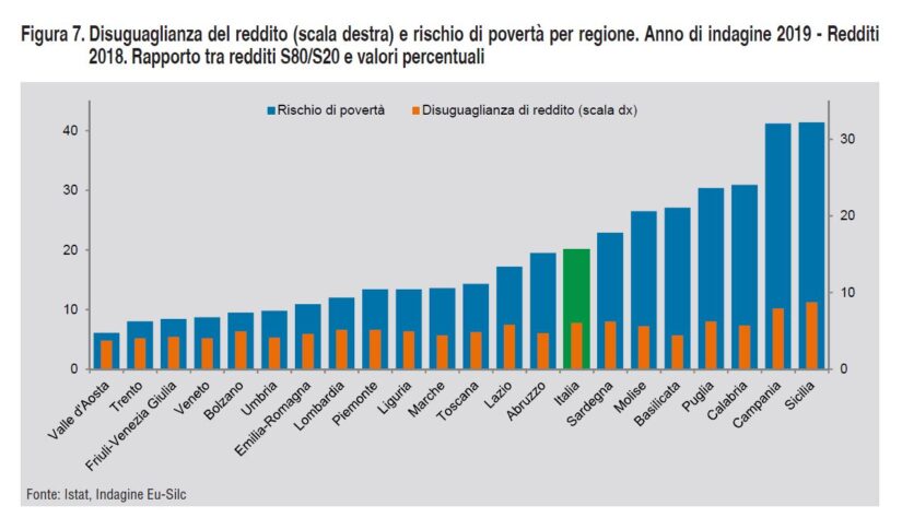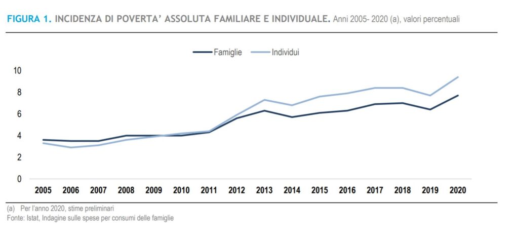Proprio rileggendo i numeri dell’Istituto di statistica emerge che gli italiani che si trovano in povertà assoluta sono 5,6 milioni. Nel solo 2020 ce ne sono stati un milione in più rispetto all’anno precedente. Oltre 335mila famiglie in più che in termini percentuali significano un passaggio da 6,4% del 2019 al 7,7% dello scorso anno.