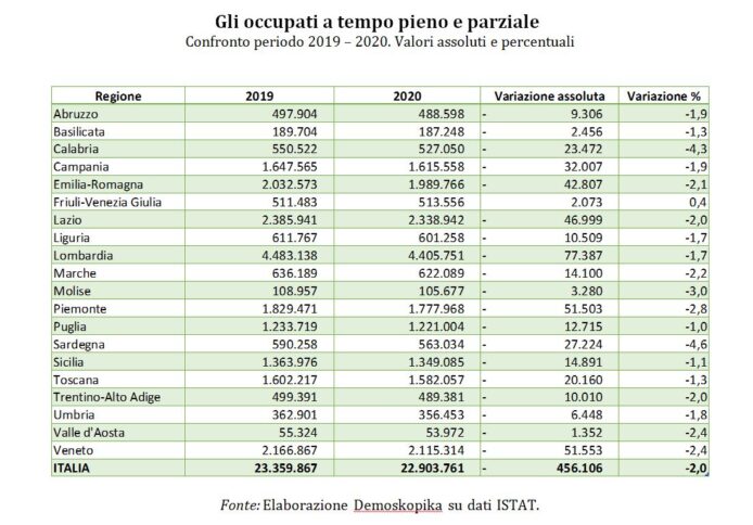 Secondo sempre il report di Demoskopika, tra il 2019 e il 2020 sono stati bruciati sull’altare della crisi 23.472 posti di lavoro tra occupati a tempo pieno e parziale. Con una flessione pari a 4,3 punti percentuali.