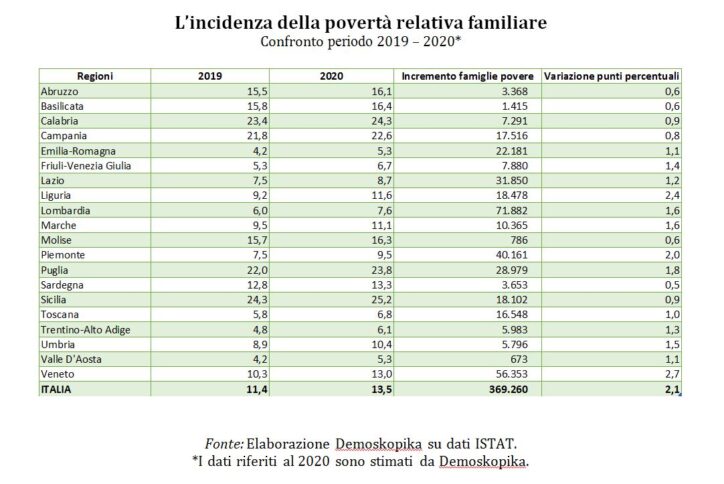 Numeri da brividi a cui si sommano quelli che sono a rischio di povertà relativa (parametro che considera povera una famiglia di due persone adulte con un consumo inferiore a quello medio pro-capite nazionale, ndr). In questo caso ad offrire un quadro della devastazione causata dalla crisi economica post covid è Demoskopika. Secondo le stime dell’Istituto demoscopico, oltre 369mila famiglie sono scivolate nell’anno buio della crisi in questa condizione. In particolare, aumenterebbe del 2,1 per cento l’incidenza delle famiglie con difficoltà economiche nella fruizione di beni e servizi, sul totale dell’universo dei nuclei familiari italiani: si passa dall’11,4 per cento del 2019 al 13,5 per cento del 2020.