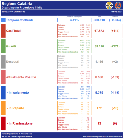 – Catanzaro: CASI ATTIVI 860 (31 in reparto, 3 in terapia intensiva, 826 in isolamento domiciliare); CASI CHIUSI 9.224 (9.085 guariti, 139 deceduti).
