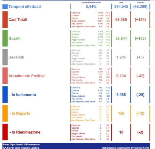 CATANZARO In Calabria, ad oggi, il totale dei tamponi eseguiti sono stati 89.4045 (+2.389). Le persone risultate positive al Coronavirus sono 68.080 (+130) rispetto a ieri. Questi sono i dati giornalieri relativi all’epidemia da Covid-19 comunicati dai Dipartimenti di Prevenzione delle AA.SS.PP. della Regione Calabria.