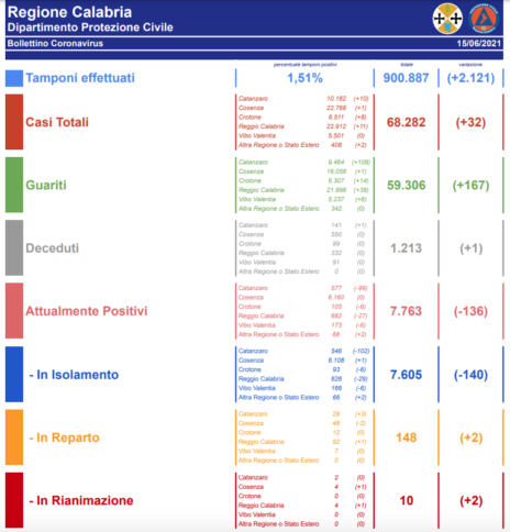– Crotone: CASI ATTIVI 105 (12 in reparto, 0 in terapia intensiva, 93 in isolamento domiciliare); CASI CHIUSI 6406 (6307 guariti, 99 deceduti)