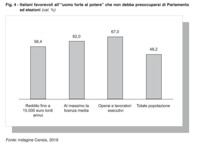 Nello stesso rapporto emerge infatti uno spaccato molto largo di soggetti che sono favorevoli ad “un uomo al potere” che «non debba preoccuparsi di Parlamento ed elezioni». Se a questa soluzione si dice pronta circa la metà degli italiani (48,2%), la quota sale al 67% tra gli operai, i soggetti meno istruiti (62%) e le persone con bassi redditi (56,4%).