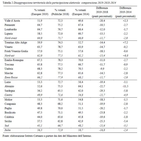 Anche qui con grandi differenze territoriali. Infatti se la zona geografica del Centro-nord resta quella a più alta partecipazione, il Meridione (seppur in tenuta rispetto a 5 anni prima) continua a registrare maggiore astensionismo.